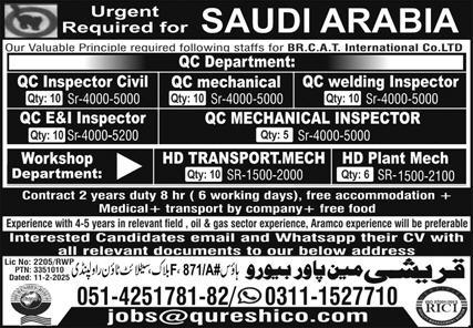 Qureshi Manpower Bureau jobs advertisement dated about 21 February 2025 in daily Express Newspaper invites application for the vacant post of qc inspector, qc mechanical inspector, hd plant mechanic, qc inspector civil, qc welding inspector, hd transport mechanic, qc mechanical and qc e&i inspector in Dammam, riyadh Saudi Arabia. Educational qualifications required DAE, B.E, Intermediate, Matric and Bachelor etc.