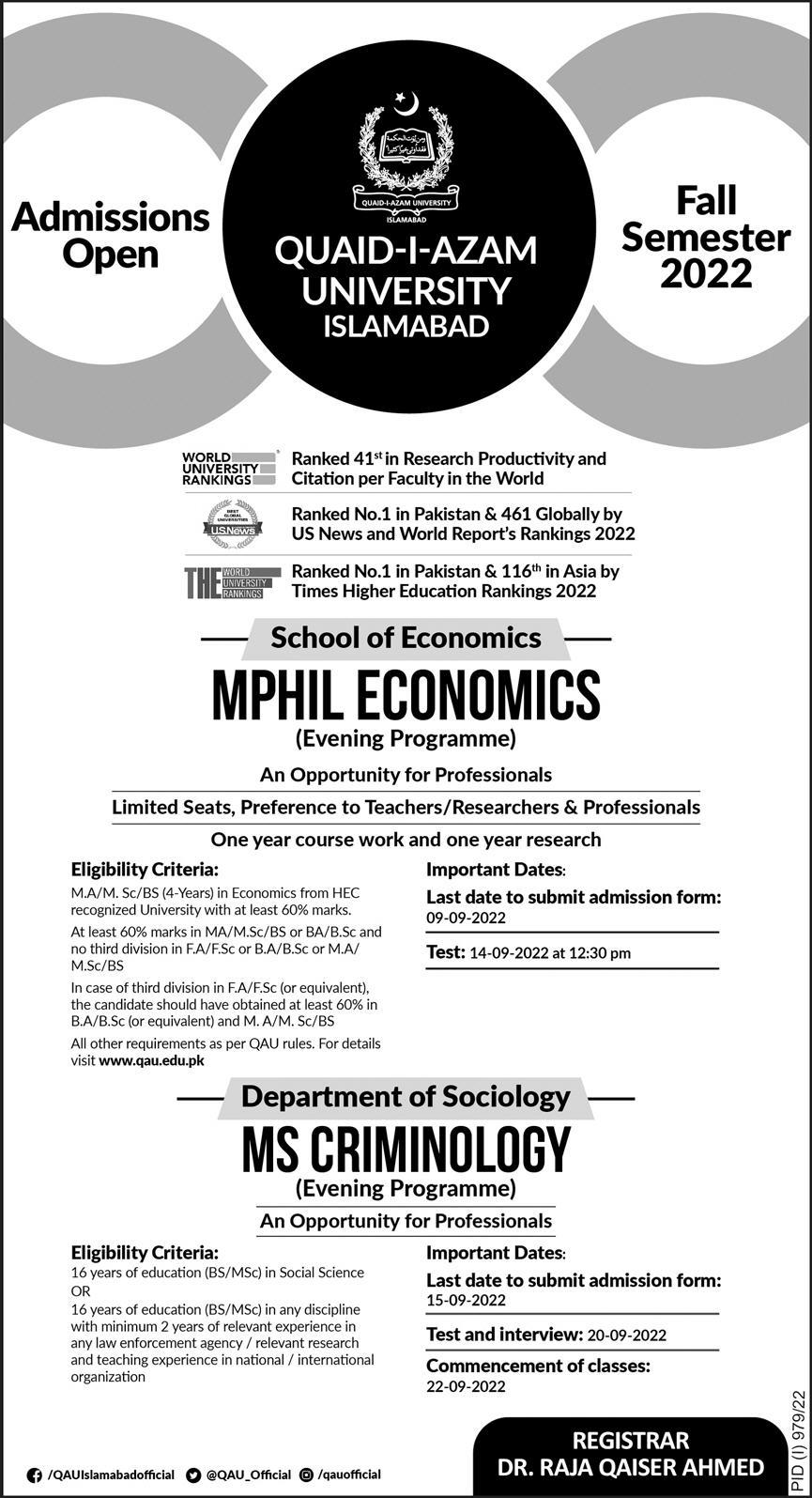 Admissions in Quaid i Azam University 2022 for Master Criminology,MPhil Economics Note: Admission Last Date for MPhil Economics is 09 September, 2022. has been announced. Students who want to take admissions in Quaid i Azam University Islamabad Islamabad Pakistan for academic year 2022 to continue education in Teaching M. Phil can apply. Students for admissions in MS and Mphil can apply for online or campus classes as per Private institute criteria till admission closing date September 15, 2022. Read newspaper ad for exact details.