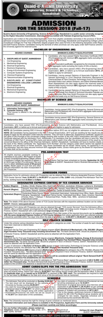 Quaid e Awam University of Engineering, Sciences & Technology Admission in Graduate Program in Nawab Shah. Read newspaper ad for exact details.