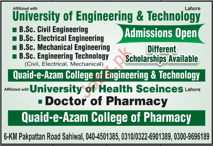 Quaid e Azam College of Engineering & Technology has announced admissions in B.Sc Civil Engineering, B.Sc Electrical Engineering, B.Sc Mechanical Engineering, B.Sc Engineering Technology in Civil, Electrical, Mechanical, Doctor of Pharmacy in Lahore. Quaid e Azam College of Engineering & Technology is affiliated with UET Lahore and University of Health Sciences. Read newspaper ad for exact details.