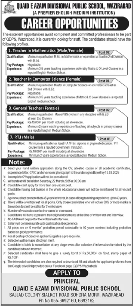 Quaid e Azam Divisional Public School is looking for candidates for following posts as per job advertisement published in daily Dunya Newspaper of February 28, 2025 for location Wazirabad, wazirabad Punjab Pakistan: