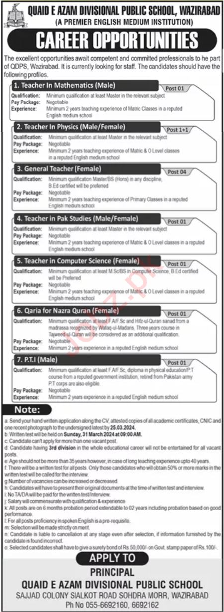 Quaid e Azam Divisional Public School jobs advertisement dated about 10 March 2024 in daily Dunya Newspaper invites application for the vacant post of teacher, mathematics teacher, pti, pak studies teacher, nazra quran teacher, computer science teacher, physical training instructor, physics teacher, general teacher and qaria in Wazirabad, wazirabad Punjab Pakistan. Preferred Education is Bachelor, Master and Mphil etc.