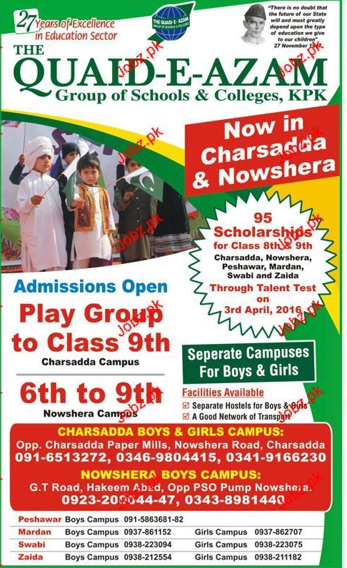 Quaid-e-Azam Group of School & College Admission in Playgroup to Matric in Nowshera. Read newspaper ad for exact details.