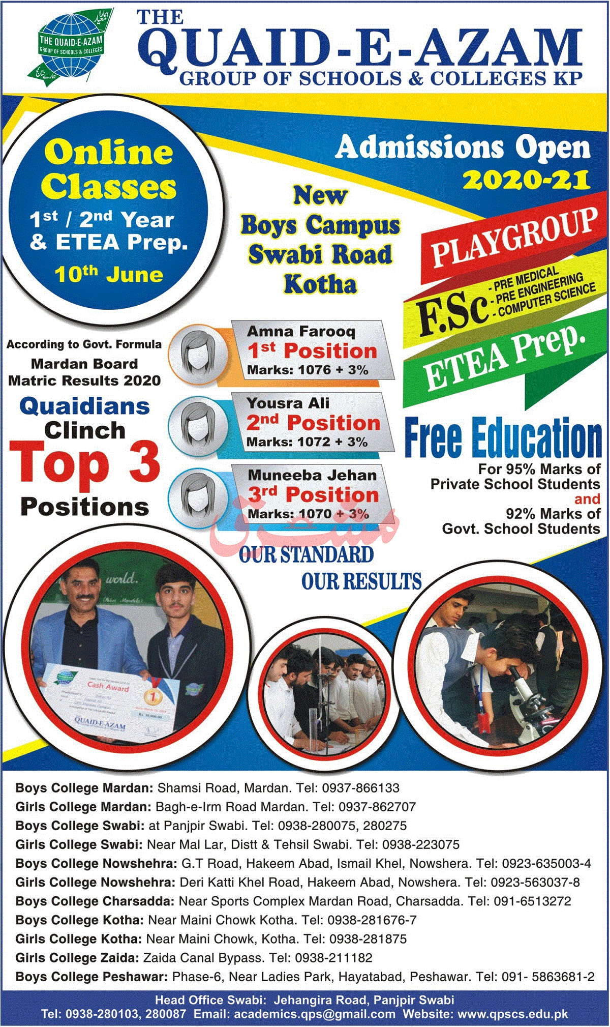 Quaid E Azam Group of Schools & Colleges Peshawar, Pakistan is starting admissions fall 2020 for the classes of PG to class 9th, FA, ICS, F Sc in Pre Medical and Pre Engineering. Read newspaper ad for exact details.