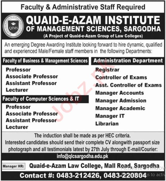 Vacant posts including lecturer, assistant controller of examination, professor, manager accounts, associate professor, manager admission, manager it, librarian, manager academic, assistant professor, registrar and controller of examination are announced in Quaid E Azam Institute of Management Sciences Sargodha, sargodha Punjab Pakistan as per 21 July 2024 advertisement in daily Jang Newspaper. Preferred Education is Master, Mphil, MS, Phd and Bachelor etc.