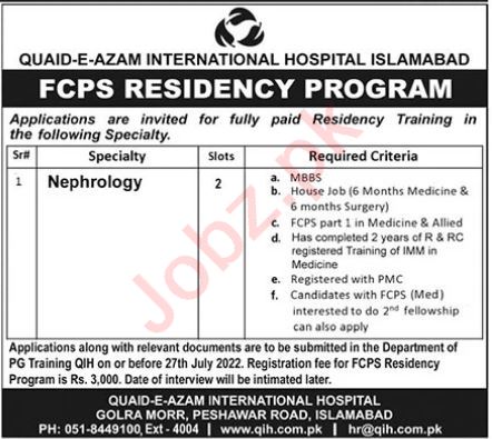 Vacant posts including fcps residency program and nephrology are announced in Quaid e Azam International Hospital Islamabad, rawalpindi Islamabad Pakistan as per 24 July 2022 advertisement in daily The News Newspaper. MBBS etc. educational qualification will be preferred.