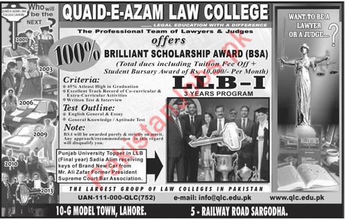 Quaid-E-Azam Law College offers admissions for Law Graduate Part-I LLB - I 3 - Year Program. The professional team of Lawyers & Judges offers brilliant scholarship award ( BSA ) Read newspaper ad for exact details.