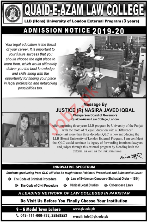 Quaid e Azam Law College has announced admissions in LLB in Lahore. Quaid e Azam Law College is affiliated with the University of London. Interesting candidates can contact on this no 042-111-000-752-35868552. Read newspaper ad for exact details.