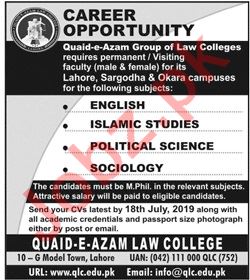 Vacancies in Quaid E Azam Law College Advertisement July 2019