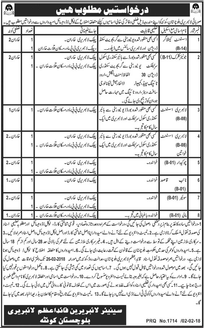 Latest Quaid E Azam Library Admin Clerical Posts Quetta 2025