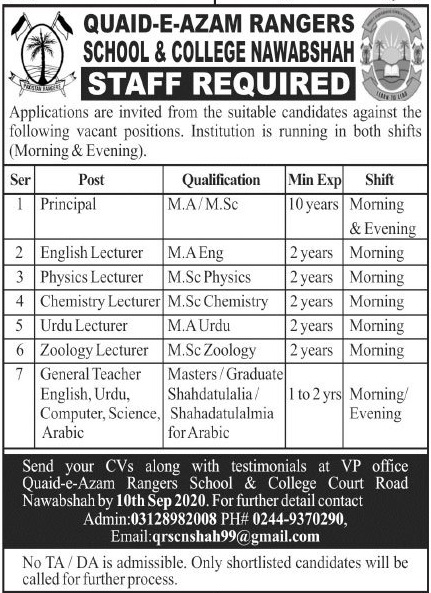 Qualified and experienced candidates for the posts of Principal, English Lecturer, Physics Lecturer, Chemistry Lecturer, Urdu Lecturer, Zoology Lecturer, General Teacher, English Teacher, Urdu Teacher, Computer Teacher, Science Teacher and Arabic Teacher required for Quaid e Azam Rangers School & College in Nawabshah.