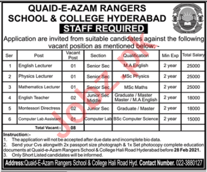 Vacancies in Quaid e Azam Rangers School & College Advertisement February 2021