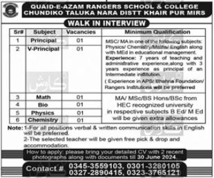 Vacancies in Quaid e Azam Rangers School & College Advertisement June 2024