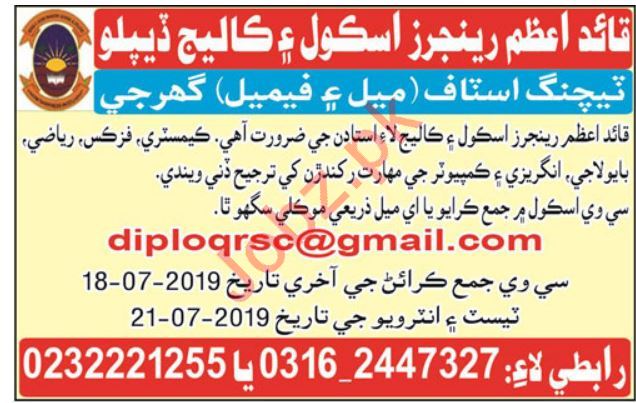 Vacancies in Quaid e Azam Rangers School & College Advertisement July 2019