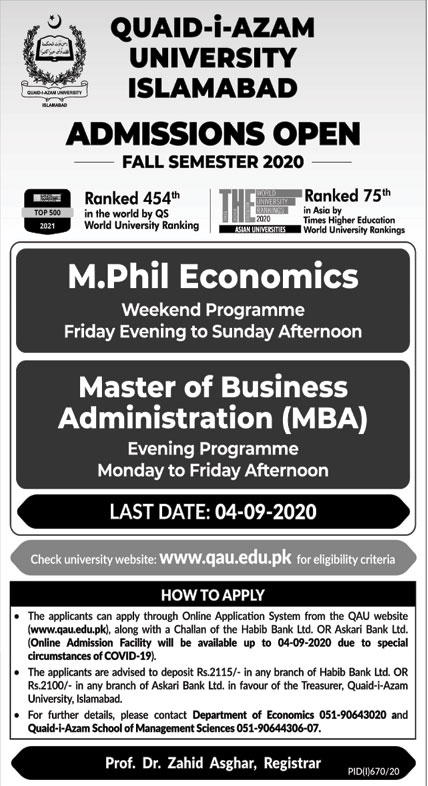 Quaid i Azam University QAU is a public sector university has announced admissions in M.Phil Economics and Master of Business Administration MBA in Islamabad Pakistan. Read newspaper ad for exact details.