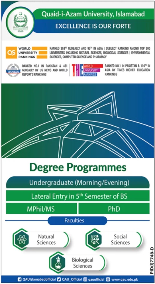 Quaid i Azam University BS, MS, MPhil and PhD admissions 2023