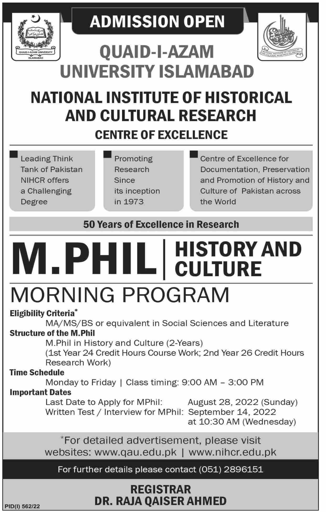 Quaid i Azam University, National Institute of Historical And Cultural Research Center of Excellence has announced admissions 2022 for Mphil in History & Culture. Eligible students who qualify as per admission criteria in Quaid i Azam University Islamabad Islamabad Pakistan can apply in Science M. Phil for academic year 2022. Students for admissions in Mphil & criteria can apply as per Government institute admission policy 2022 before closing date August 28, 2022 as per advertisement. Read newspaper ad for exact details.