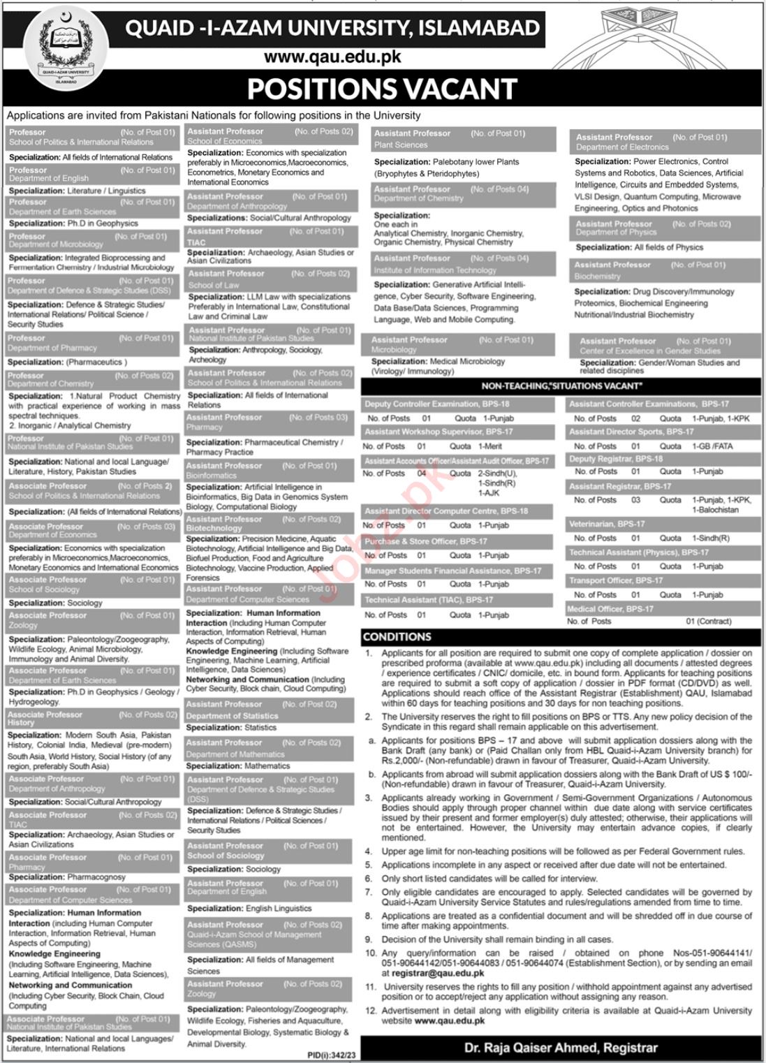 Vacancies in Quaid i Azam University Advertisement July 2023