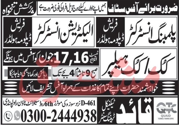 Quaid Technical Training Center Satellite Town - 6th Road Rawalpindi, rawalpindi Punjab Pakistan invites applications from eligible candidates for the post of cook, cook helper, plumbing instructor and electrician instructor as per advertisement of June 17, 2025 published in daily Mashriq Newspaper. Candidates with Intermediate, DAE and Matric etc. educational background will be preferred.