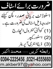 Quality Control Incharge, Store Keeper Job Opportunity