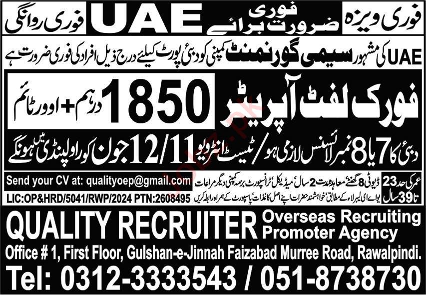 Quality Recruiter Overseas Employment Promoter Agency invites applications for job positions advertised in daily Express dated 10 June 2024 for following vacancies in Abu Dhabi, abu dhabi UAE.
