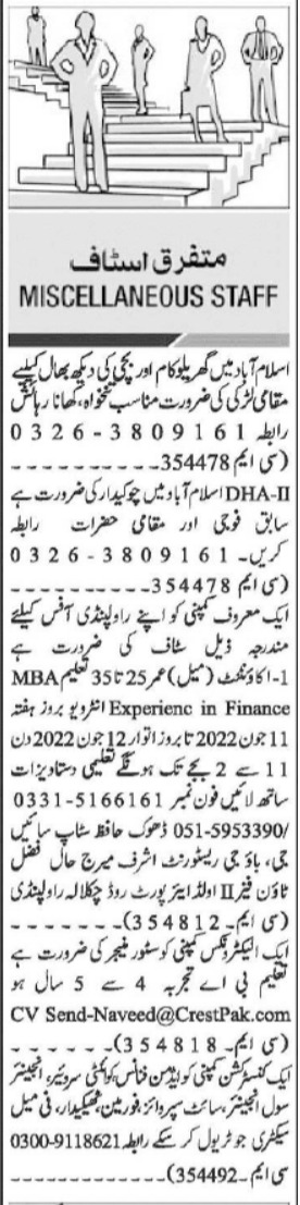 Private Company jobs advertisement dated about 9 June 2022 in daily Jang Newspaper invites application for the vacant post of store manager, finance manager, accountant, admin manager, civil engineer, site supervisor, secretary, maid, foreman, house maid, aya, female secretary, nanny, engineer, chowkidar and quantity surveyor in Islamabad, islamabad Islamabad Pakistan. Preferred Education is Matric, Middle, Intermediate and Bachelor etc.
