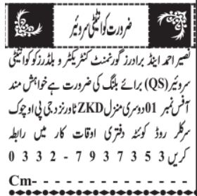 Naseer Ahmad & Brothers Quetta, quetta Balochistan Pakistan invites applications from eligible candidates for the post of quantity surveyor as per advertisement of February 14, 2023 published in daily Jang Newspaper. Educational qualifications required Intermediate and Bachelor etc.