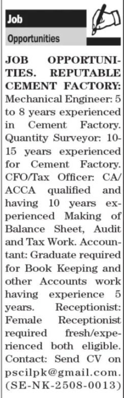 Private Company is looking for candidates for following posts as per job advertisement published in daily The News Newspaper of September 06, 2025 for location Karachi, karachi Sindh Pakistan: