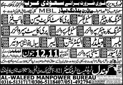 Vacant posts including labor, htv driver, electrician, shuttering carpenter, precast supervisor, quantity surveyor, driver, pipe fitter, steel fixer, steel fixer supervisor, plumber, precast concrete mason, safety supervisor, welder and shuttering carpenter supervisor are announced in Al Waleed Manpower Bureau Dammam, dammam Saudi Arabia as per 10 June 2022 advertisement in daily Express Newspaper. Educational qualifications required Middle, Bachelor, Matric and Intermediate etc.