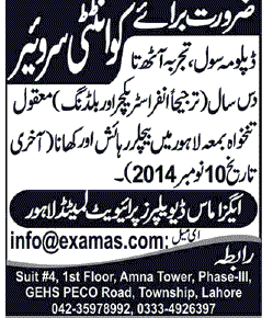Quantity Surveyors are required in Examas Developers Pvt Ltd in lahore.