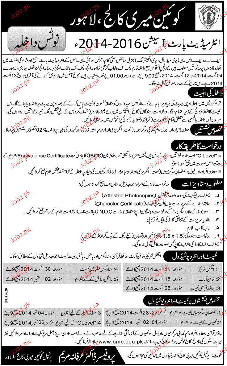 Queen Mary University of London Admission in FA / Fsc in Lahore. Read newspaper ad for exact details.