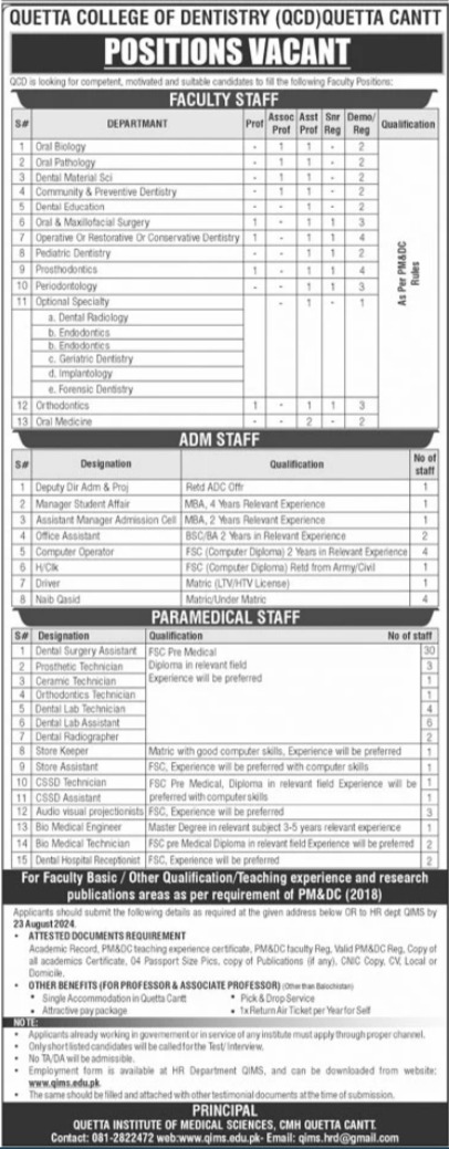 Vacancies in Quetta College of Dentistry QCD Advertisement August 2024