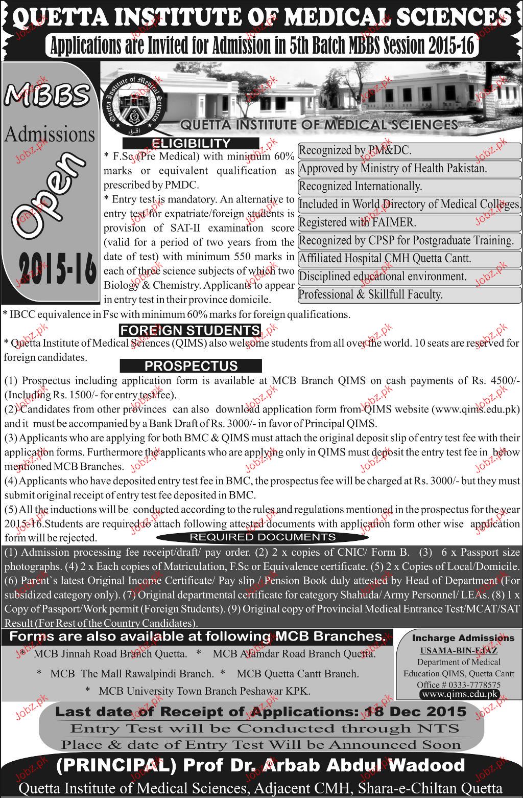 Quetta Institute of Medical Sciences Admission in MBBS in Quetta. Read newspaper ad for exact details.