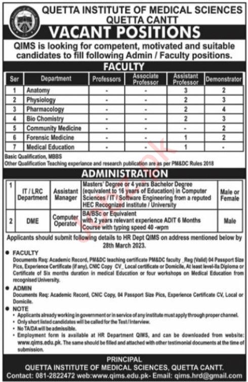 Quetta Institute of Medical Sciences QIMS jobs advertisement dated about 12 March 2023 in daily Nawaiwaqt Newspaper invites application for the vacant post of associate professor, demonstrator, assistant professor and professor in Quetta, quetta Balochistan Pakistan. Educational qualifications required Master, Mphil, Bachelor and Phd etc.