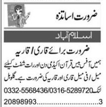 Vacant posts including qari and qaria are announced in Quran Academy Islamabad, islamabad Islamabad Pakistan as per 4 July 2023 advertisement in daily Express Newspaper. Persons with Middle, Intermediate and Matric etc. education can apply.