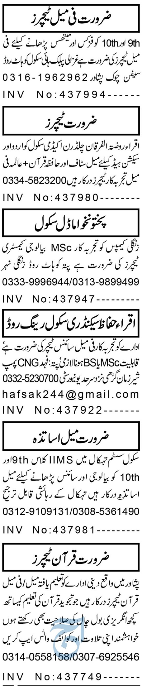 Private School is looking for candidates for following posts as per job advertisement published in daily Aaj Newspaper of January 11, 2025 for location Peshawar, peshawar Khyber Pakhtunkhwa KPK Pakistan: