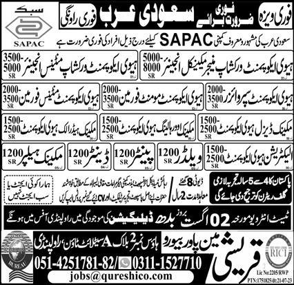 Qureshi Manpower Bureau invites applications for job positions advertised in daily Express dated 23 July 2023 for following vacancies in Makkah, madina Saudi Arabia.