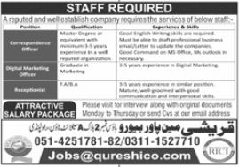 Vacant posts including officer, receptionist and marketing officer are announced in Qureshi Manpower Bureau Rawalpindi, rawalpindi Punjab Pakistan as per 24 December 2023 advertisement in daily Jang Newspaper. Candidates with Intermediate, Master and Bachelor etc. educational background will be preferred.