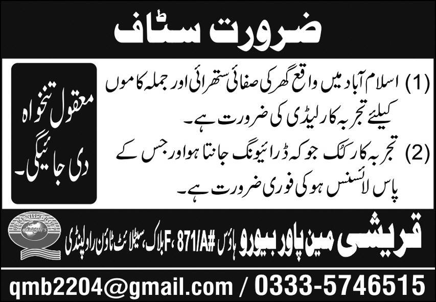 Qureshi Manpower Bureau jobs advertisement dated about 9 October 2025 in daily Express Newspaper invites application for the vacant post of cook, driver, maid and house maid in Satellite Town - Block F Rawalpindi, rawalpindi Punjab Pakistan. Educational qualifications required Middle, Matric and Primary etc.