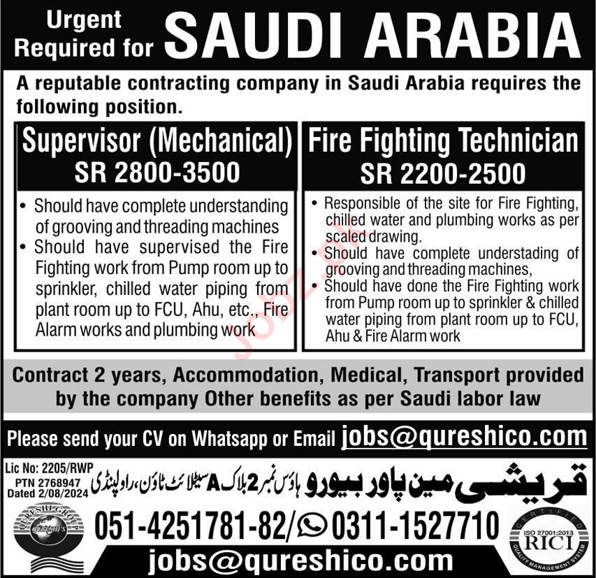 Qureshi Manpower Bureau jobs advertisement dated about 5 August 2024 in daily Express Newspaper invites application for the vacant post of supervisor mechanical and fire fighting technician in Riyadh, riyadh Saudi Arabia. Preferred Education is Primary, Matric, Middle and Intermediate etc.