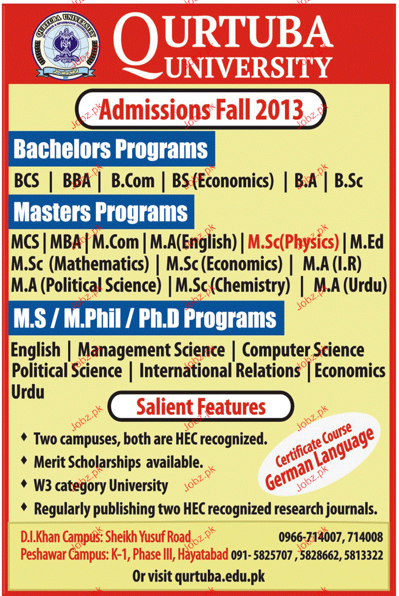 Qurtba University Admission in BCs, BBA, BCom and BSc in Peshawar Read newspaper ad for exact details.