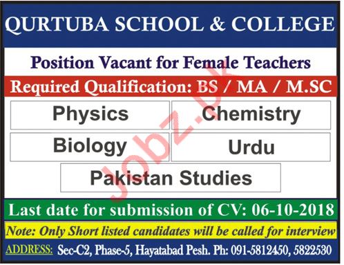 Qurtuba School & College Teachers Jobs 2018 In Peshawar KPK