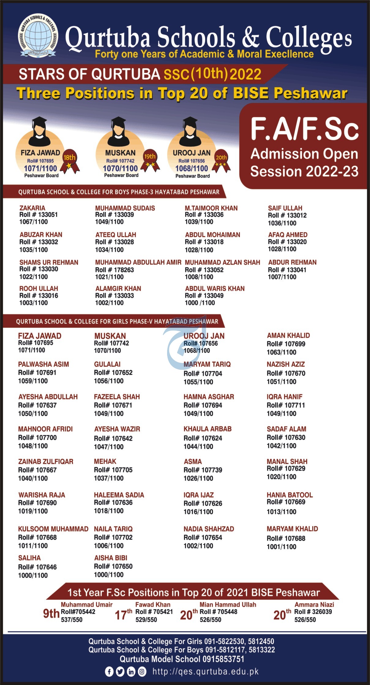 Qurtuba Schools of Excellence has announced admissions 2022 for F.A, F.Sc.. Eligible students who qualify as per admission criteria in Qurtuba Schools of Excellence Peshawar Khyber Pakhtunkhwa KPK Pakistan can apply in Teaching College for academic year 2022. Eligible students for fulfilling criteria for admissions in Intermediate can enroll as per Private admission policy 2022 till closing date. Read newspaper ad for exact details.