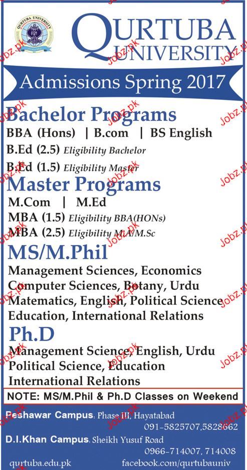 Qurtuba University Admission in BBA, M.Com, MS, Mphill and Phd in Peshawar. Read newspaper ad for exact details.