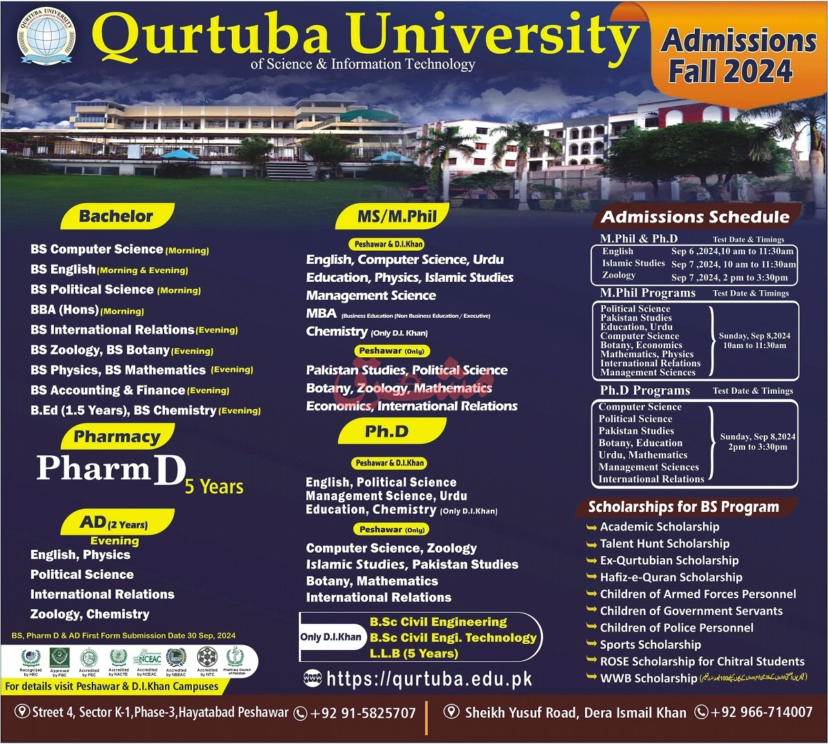 Admissions in Qurtuba University of Science and Information Technology 2024 for BS, MS, MPhil, Pharm D, ADP, PhD has been announced. Students who want to take admissions in Qurtuba University of Science and Information Technology Peshawar Khyber Pakhtunkhwa KPK Pakistan for academic year 2024 to continue education in Science University can apply. Eligible students for fulfilling criteria for admissions in Pharm D, MS, ADP, BS, B.ed and Mphil can enroll as per Government admission policy 2024 till closing date 14 September 2024. Read newspaper ad for exact details.
