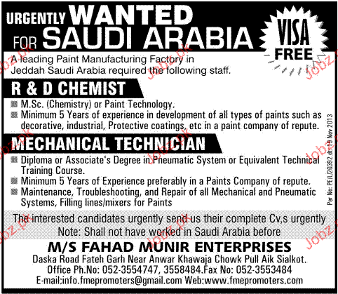 R & Chemist and Mechanical Technicians Job Opportunity