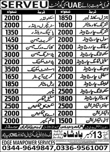BTTC Badshah Overseas Employment Promoters Abu Dhabi, dubai UAE invites applications from eligible candidates for the post of finishing chargehand, plant mechanic, electrician, brush painter, general skilled labor, safety chargehand, steel fixing chargehand, shuttering carpenter, crane operator, time keeper, plaster mason, steel fixer, assistant mechanic, logistic chargehand, shuttering chargehand, civil chargehand, ac technician, racking chargehand, scaffolder, structural welder, mechanical technician, plumber, auto electrician, scaffolding chargehand, carpenter chargehand, piping welder, concrete mason and clock work mason as per advertisement of December 11, 2025 published in daily Express Newspaper. Bachelor, DAE, Intermediate, Matric and Others etc. educational qualification will be preferred.