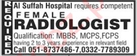 Vacant posts including female radiologist are announced in Al Suffah Hospital Islamabad, islamabad Islamabad Pakistan as per 14 July 2024 advertisement in daily Jang Newspaper. Candidates with MBBS and Others etc. educational background will be preferred.