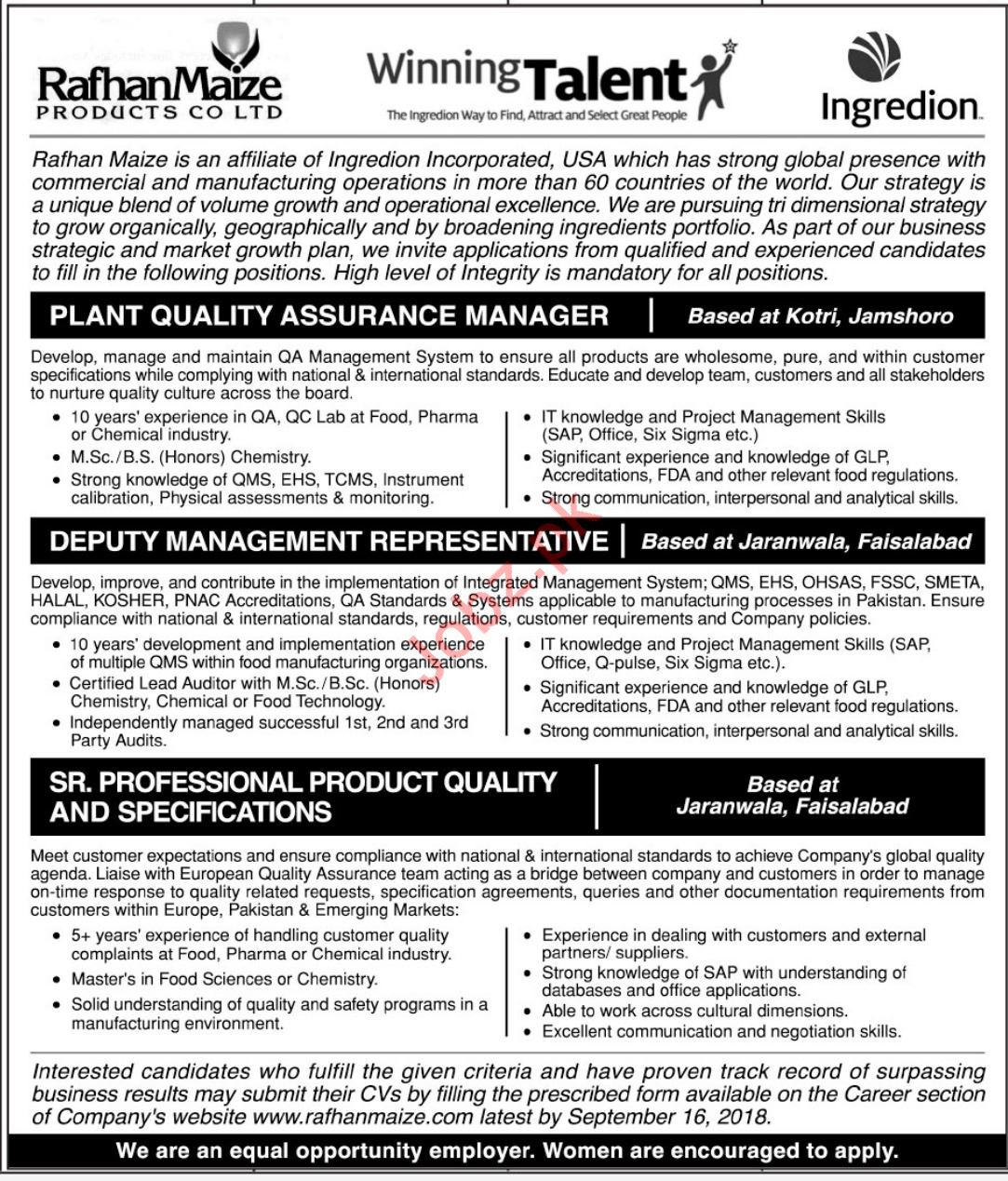 RafhanMaize Products Co Limited is currently looking for highly qualified and well educated individuals for the posts of Plant Quality Assurance QA Manager, Deputy Management Representative, Sr Professional Product Quality And Specifications in Jamshoro & Faisalabad.