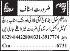Rah e Taleem School & College Satellite Town Quetta, quetta Balochistan Pakistan invites applications from eligible candidates for the post of female teacher and teacher as per advertisement of April 18, 2025 published in daily Jang Newspaper. Educational qualifications required Master and Bachelor etc.
